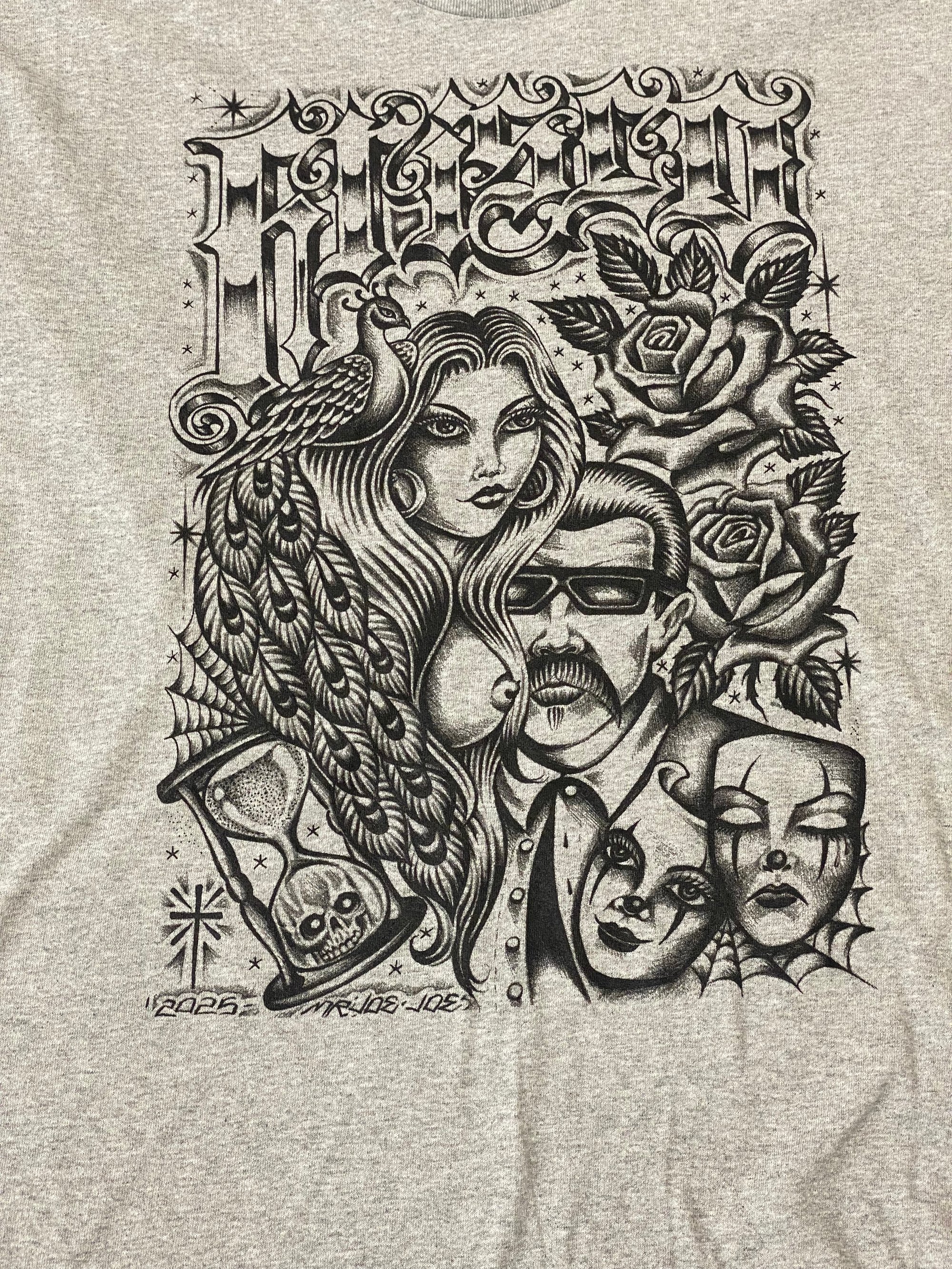 90% Cotton Tee Front Graphic made by Jonah Levin Frisco Tattoo Old English Logo on the back. Multiple colors available while supplies last.